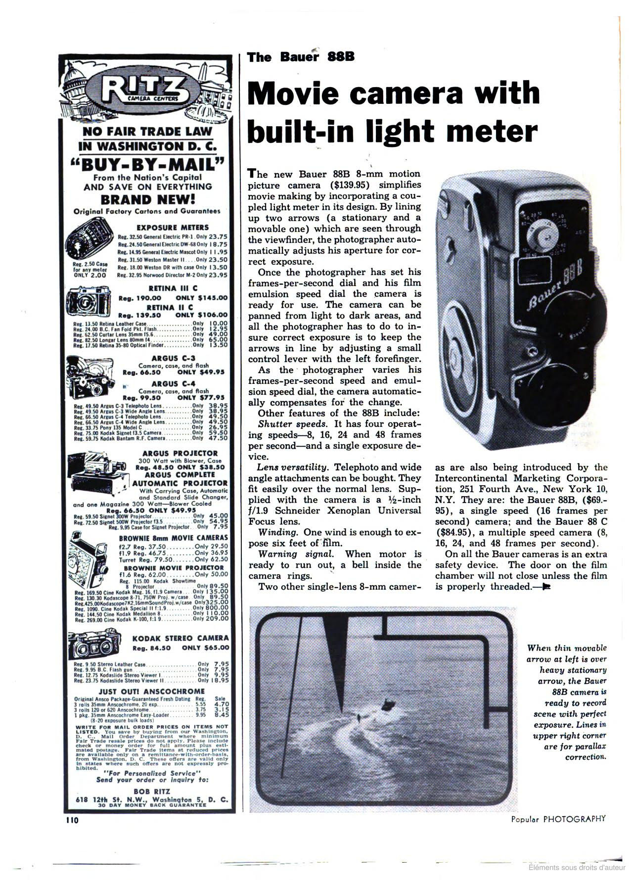 "La nouvelle Bauer 88B, caméra 8 mm, simplifie la réalisation de films grâce à un posemètre couplé intégré dans sa conception. En alignant deux flèches — l'une fixe et l'autre mobile — visibles dans le viseur, l’utilisateur règle automatiquement l’ouverture pour obtenir une exposition correcte.