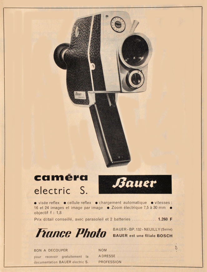 En 1963 BAUER lance la BAUER Electric S, un modèle entièrement électrique y compris pour l'entrainement du film 8mm Double 8. Elle est équipée d'un zoom BAUER 7.5-30mm et sera fabriquée jusqu'en 1966 (Après l'arrivée du Super 8 et des modèles C1 et C2).