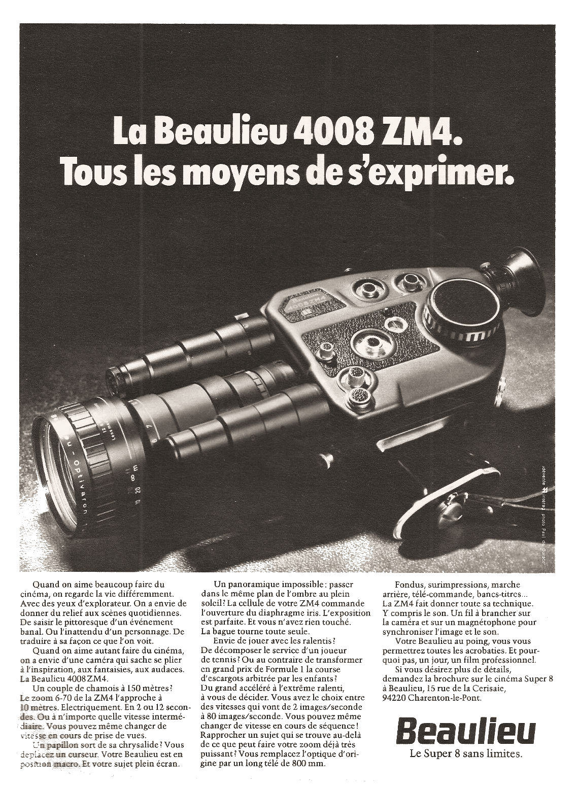 En 1976, la BEAULIEU 4008 ZM 4 est la dernière camera muette fabriquée par BEAULIEU. C'est aussi la camera Super 8 muette la plus aboutie. Elle est équipé exclusivement d'un objectif Schneider Kreuznach Optivaron 6-70 ouvrant f/1.4.