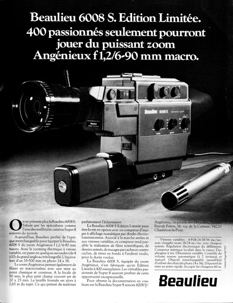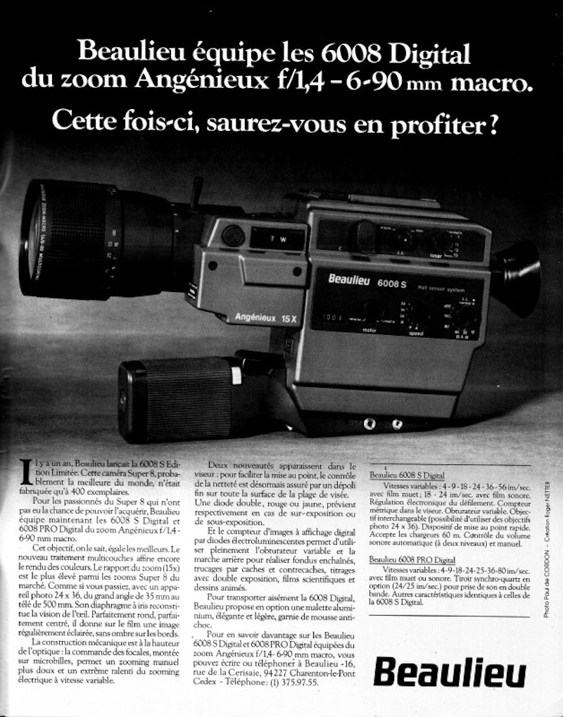 En 1979 la BEAULIEU 6008 S succède à la 5008.S. Elle se distingue de son ainée par les formes plus anguleuses de son boitier en polycarbonate armé de fibres de verre qui remplace la tôle emboutie.