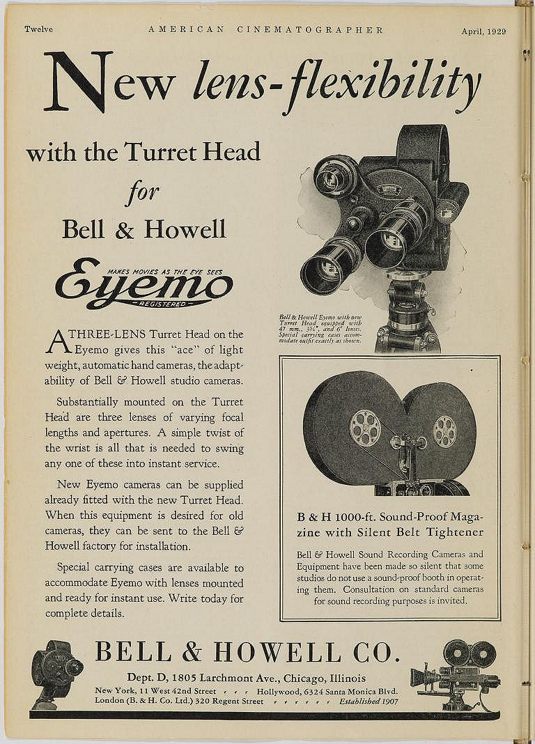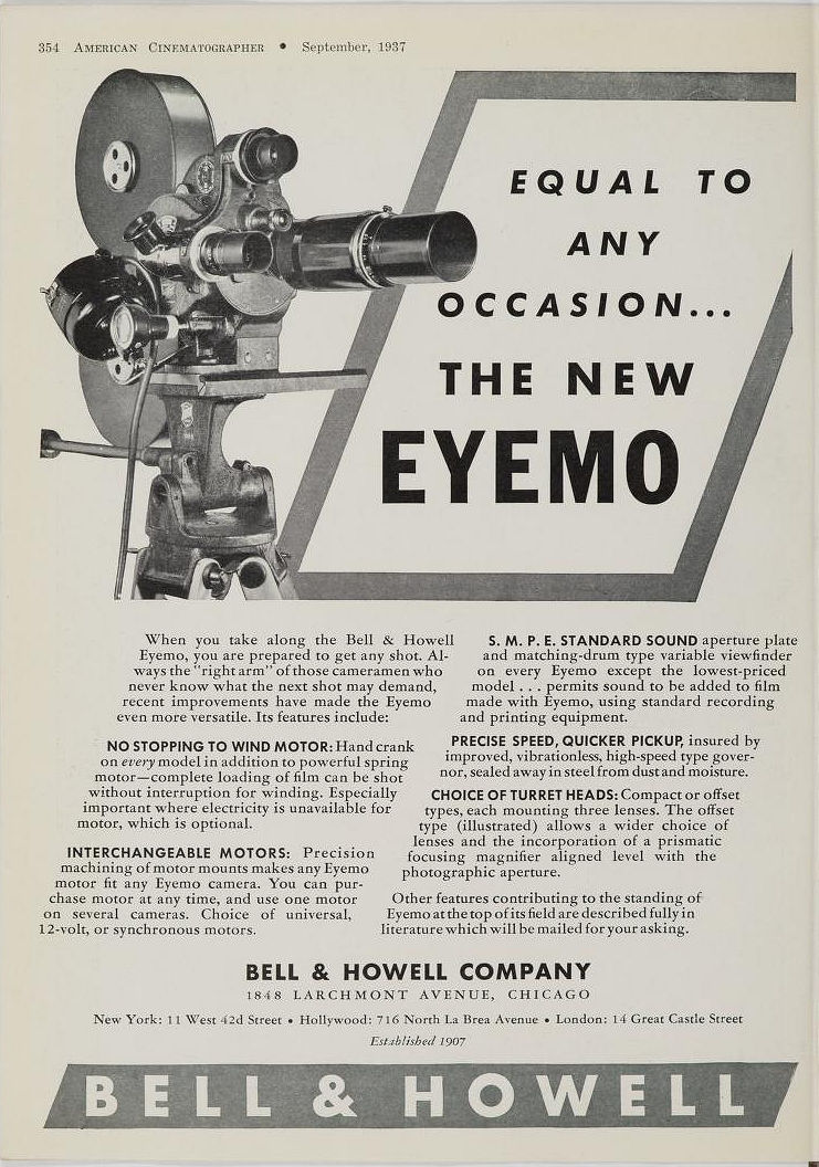 Bien que destiné aux professionnels par le format de film utilisé, 35 mm, la modèle Eyemo mérite de figurer dans cet inventaire pour sa présence sur les sites d'enchères en ligne et sa place dans l'histoire du cinéma de reportage. Lancé en 1925, par Bell & Howell, il suivra l'évolution de la Filmo 70, crée 2 années plus tôt.