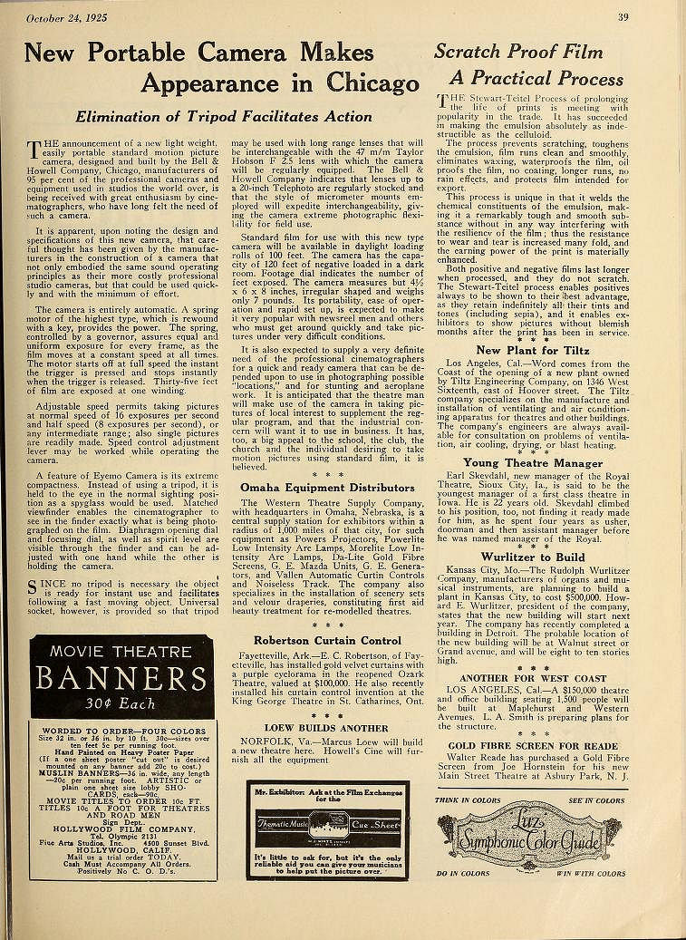 Annoncé le 10 octobre 1925 dans l'hebdomadaire New-Yorkais "Exhibitor Trade Review", il y est détaillé deux semaines plus tard (Voir image ci-contre). Les premiers exemplaires seront livrés dès le mois de Novembre de la même année. Ils seront dénommé "Standard Automatic Motion Picture Camera"; Ils présentent une silhouette similaire aux modèles "Filmo" adaptée au format de film "standard" (35 mm). Ils peuvent être chargés d'une bobine de 100 m de film inversible (avec amorce papier) ou 120 m de négatif devant être chargé en chambre noire. Le film est entrainé par un moteur à ressort disposant d'une clé de remontage amovible attaché au boitier par une chainette à billes. Le moteur démarre à pleine vitesse dès que la gâchette est enfoncée et s’arrête instantanément lorsque la gâchette est relâchée. Un remontage complet permet d'entrainer 35 pieds (environ10m) de film à la vitesse constante à 16 images par seconde. Il est également possible de filmer à 8 images par seconde et toutes les vitesses intermédiaires. La vitesse peut être modifiée en cours de prise de vue. Un compteur en pieds disposé sur le flanc droit indique la longueur de film utilisée.