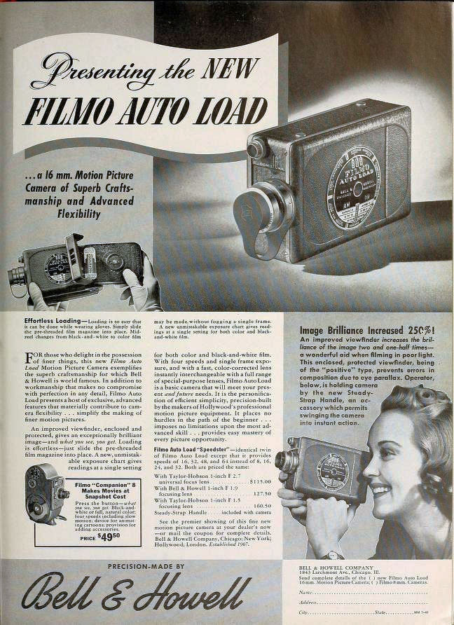 En juillet 1940, BELL & HOWELL remplace ses cameras à chargeur Filmo 141 par un nouveau modèle dénommé Filmo Auto Load. De forme et de poids sensiblement identiques aux modèles précédents, il s'en distingue par une nouvelle poignée disposée sous la camera et vissée dans le pas de fixation du pied. On remarquera également un système de visée plus lumineux. Deux plages de vitesses sont disponibles, 8 à 32 images par seconde ou 16 à 64 images par seconde sur le modèle dénommé "Speedster".