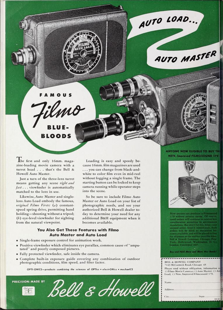 En Aout 1940, BELL & HOWELL présente son dernier modèle de camera personnelle 16mm .l'Auto-Master 16 Il s'agit d'une évolution de la caméras Auto Load à chargeur par magasin présentée un mois plus tôt. Le magasin de film préchargé Eastman Kodak est utilisé.