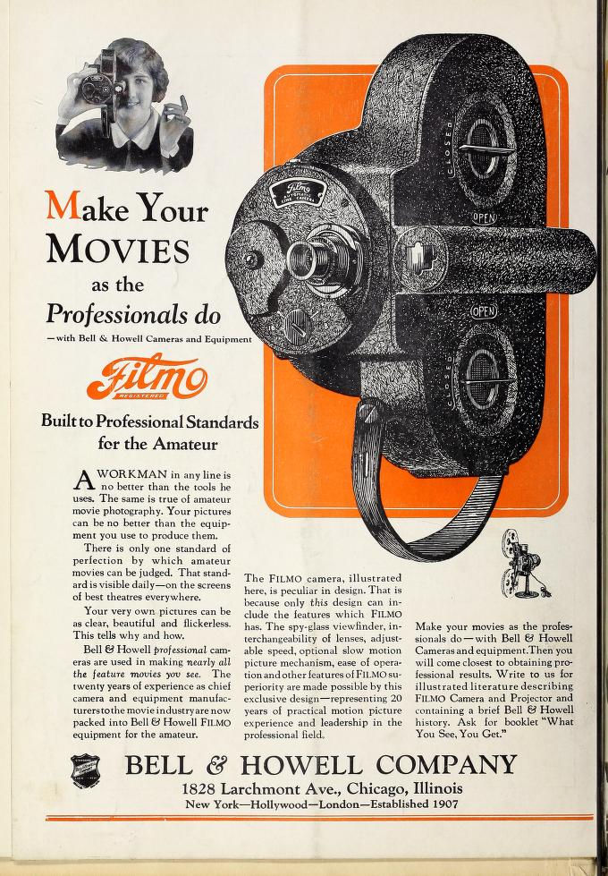 En Janvier 1923, EASTMAN KODAK COMPANY propose un nouveau film au format 16 mm, réversible et sûr à base d'acétate ainsi qu'une caméra légère et un projecteur permettant de le visionner. Début 1924, BELL & HOWELL lance la Filmo Automatic Cine Camera. Cette caméra utilise le même type de film mais intègre un moteur d'entrainement à ressort qui dispense de l'utilisation d'un trépied. De ces deux inventions majeures naitra le cinéma amateur ...