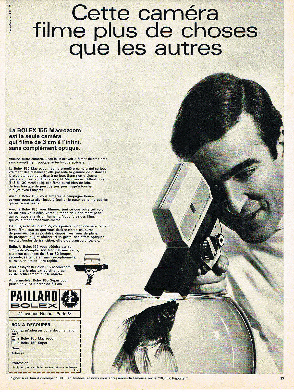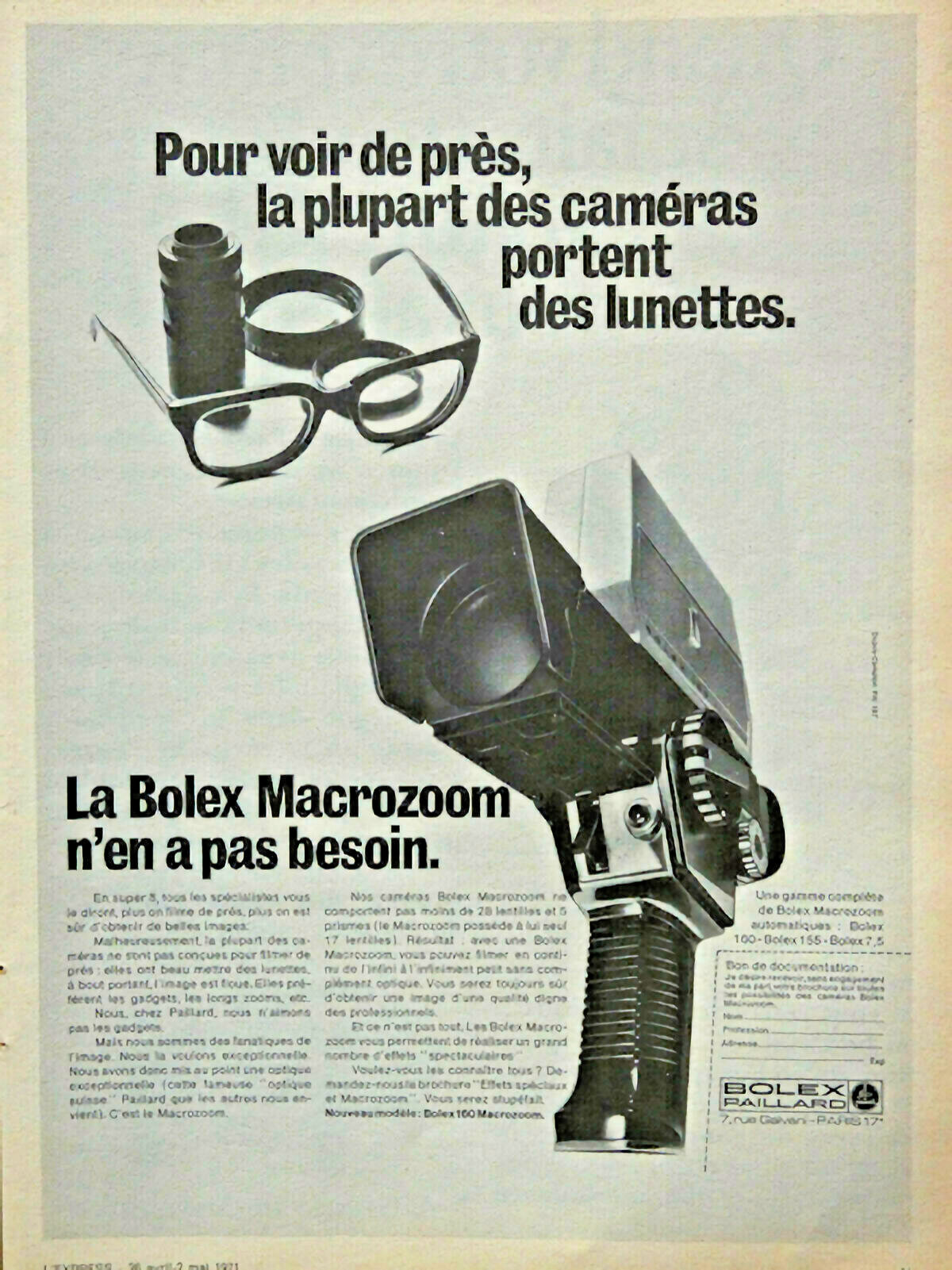 En 1968 BOLEX améliore son modèle Super 8 en permettant à son zoom les prises de vue à partir de 3cm..Ce modèle est renommé BOLEX 155 MACROZOOM. .Un système est également ajouté permettant une mise au point par coïncidence d'image. Un nouveau bouton poussoir, actionné par le pouce autorise le ralenti à 32 images par seconde. Ce modèle sera fabriqué jusqu'en 1970.