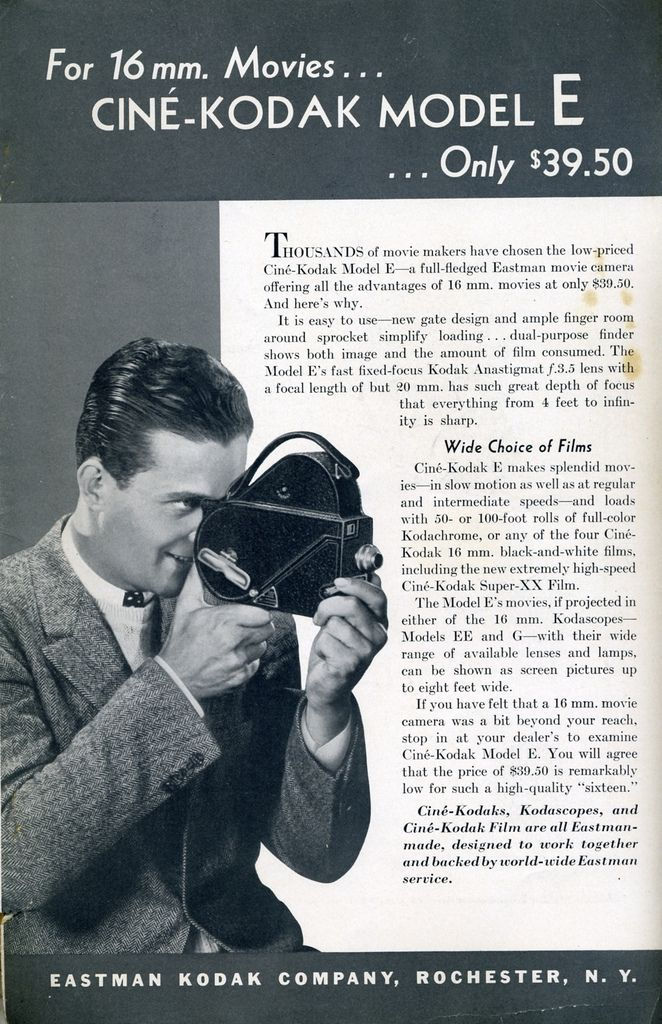 La Ciné-Kodak model E apparait dans les publicités de la marque jusqu'au début des années 40. Elle n'a pas été reprise à l'issue de la seconde guerre mondiale.