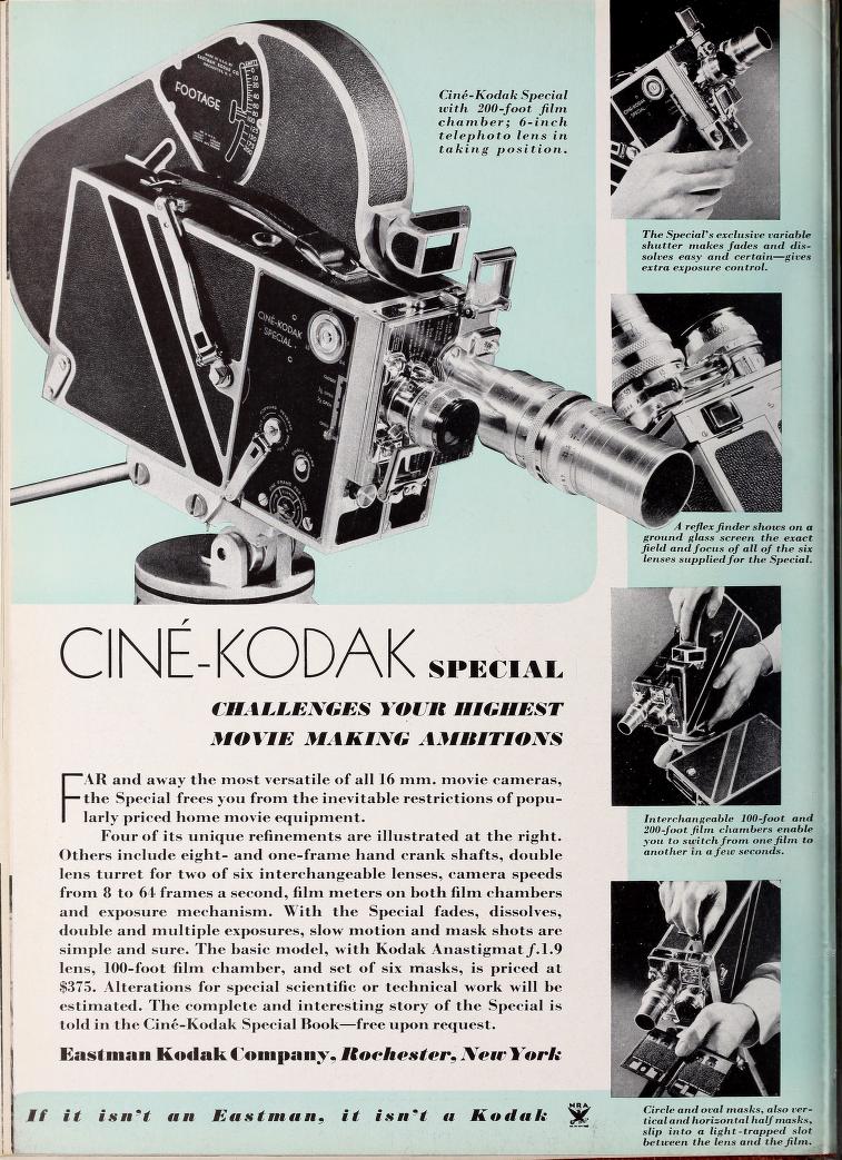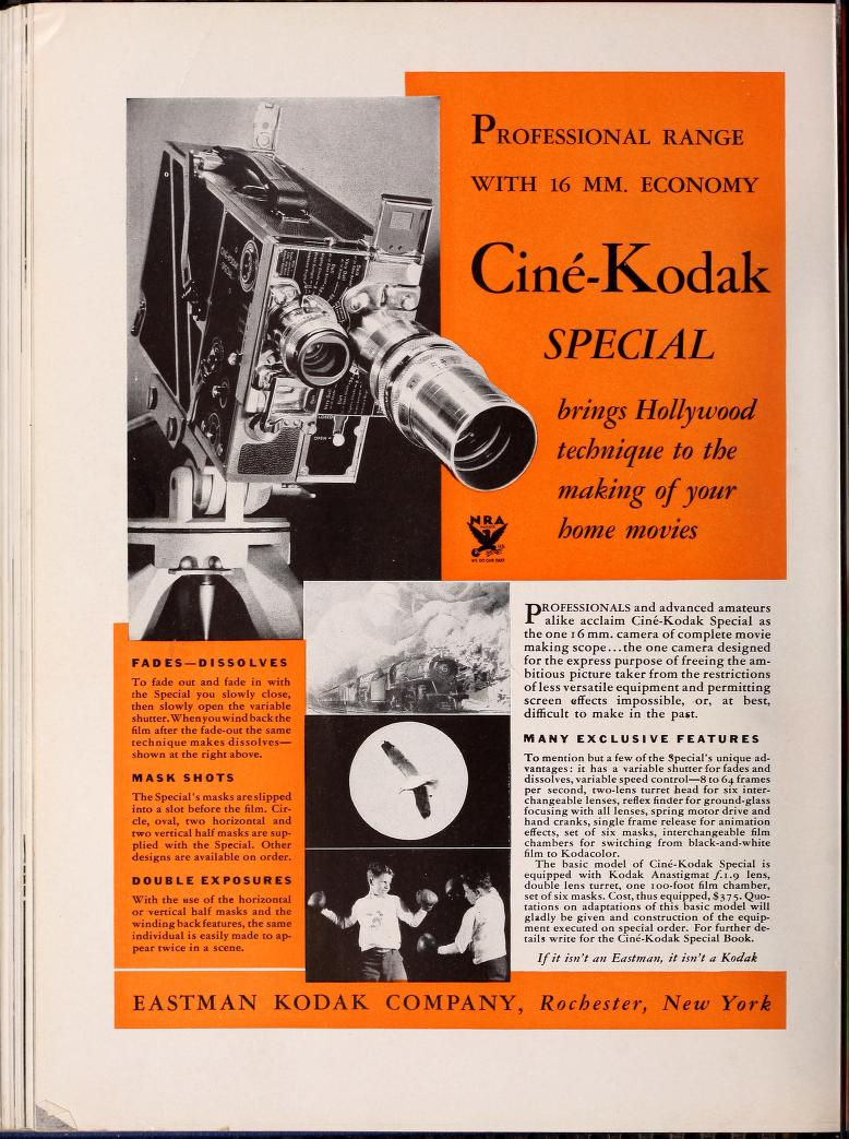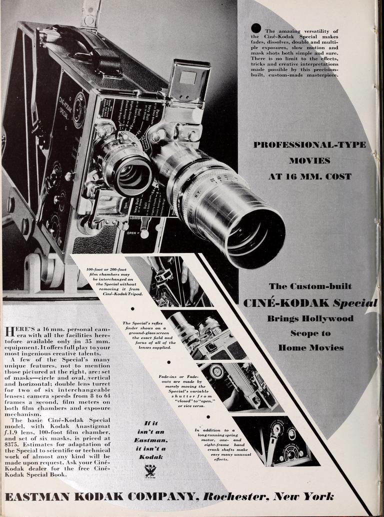 En mars 1933, Eastman Kodak présente la Cine-Kodak Special, une caméra 16 mm d’un niveau technique exceptionnel, destinée aux amateurs exigeants comme aux professionnels. Véritable concentré d’innovations, elle transpose dans le domaine du 16 mm des fonctionnalités jusqu’alors réservées aux caméras 35 mm : qualité de fabrication remarquable, possibilités mécaniques avancées et grande souplesse d’utilisation. La Special se distingue notamment par sa tourelle à deux objectifs interchangeables, son système de cassettes amovibles permettant l’emploi de films de 100 ou 200 pieds (30 à 60 mètres), ainsi que par de nombreux dispositifs facilitant la prise de vues technique ou créative. Conçue comme un outil complet, précis et durable, la Cine-Kodak Special marque une étape majeure dans l’histoire du 16 mm et s’impose rapidement comme une référence pour les cinéastes amateurs éclairés et les utilisateurs professionnels.