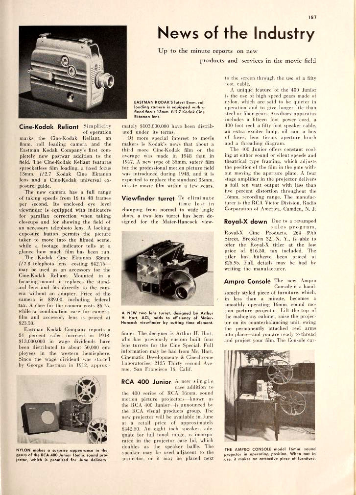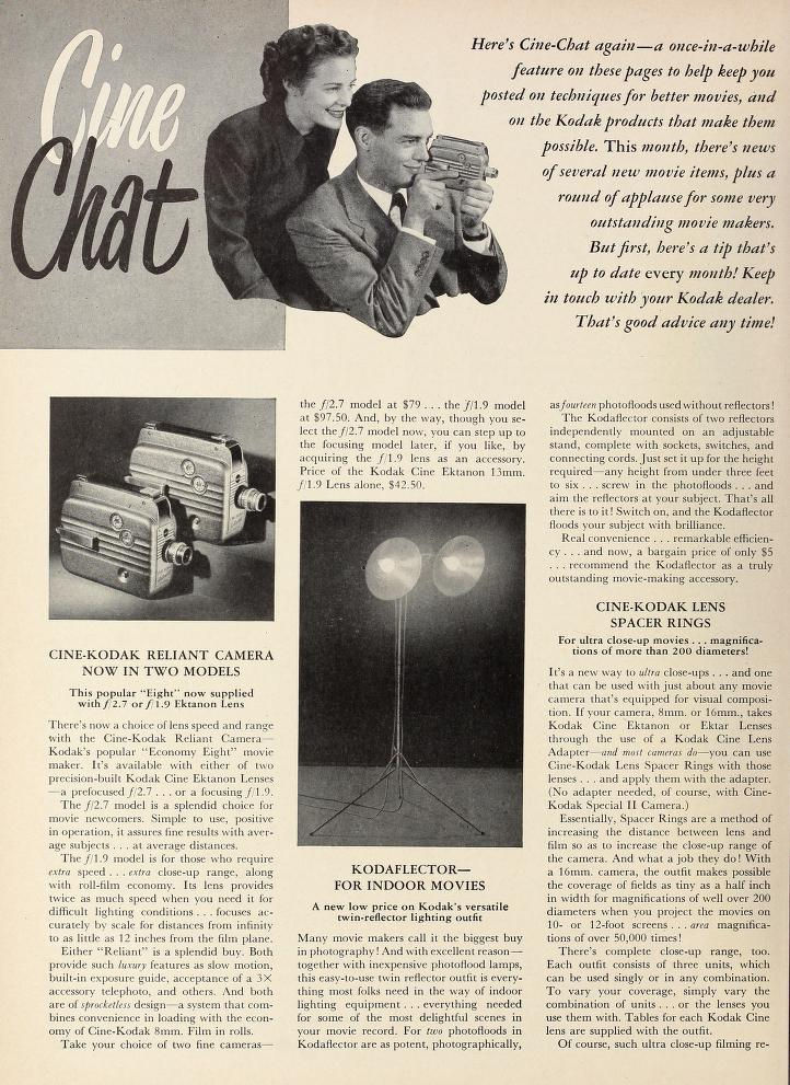 En Mai 1949 KODAK annonce la "Reliant", une caméra Double-8 à bobines qui remplacera la Cine-Kodak Eight 25 lancée en 1932. Ce modèle "d'entrée de gamme" y gagne en technicité (visée, chargement, cadences de prise de vue) même s'il y perd un peu en simplicité et beaucoup en ce qui concerne le prix d'achat. Il faudra attendre la Brownie, quelques années plus tard, pour retrouver un modèle équivalent à la "Eight" de 1932.