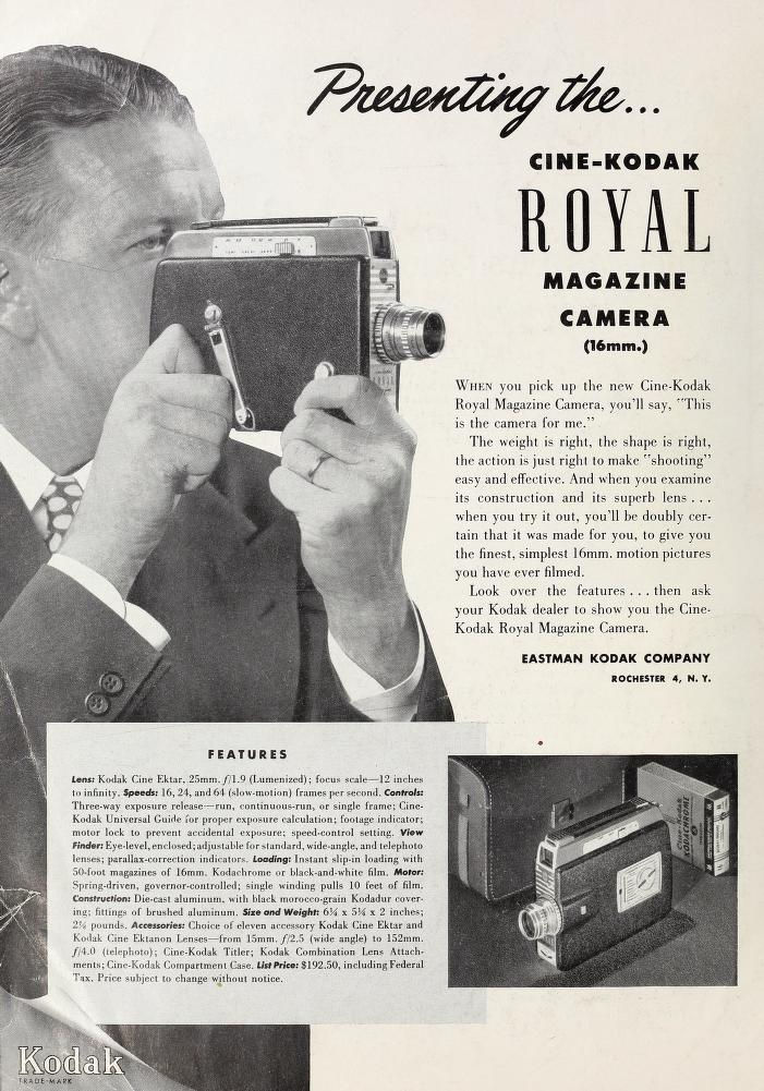 Fin 1950 EASTMAN KODAK COMPANY lance le modèle "Royal" à magazin 16 mm en remplacement de l'antique "Cine-Kodak Magazine 16" de 1936. Cette caméra adopte un nouveau viseur commun aux autres modèles de la marque. Les caractéristiques principales restent les même que le modèle précédent.