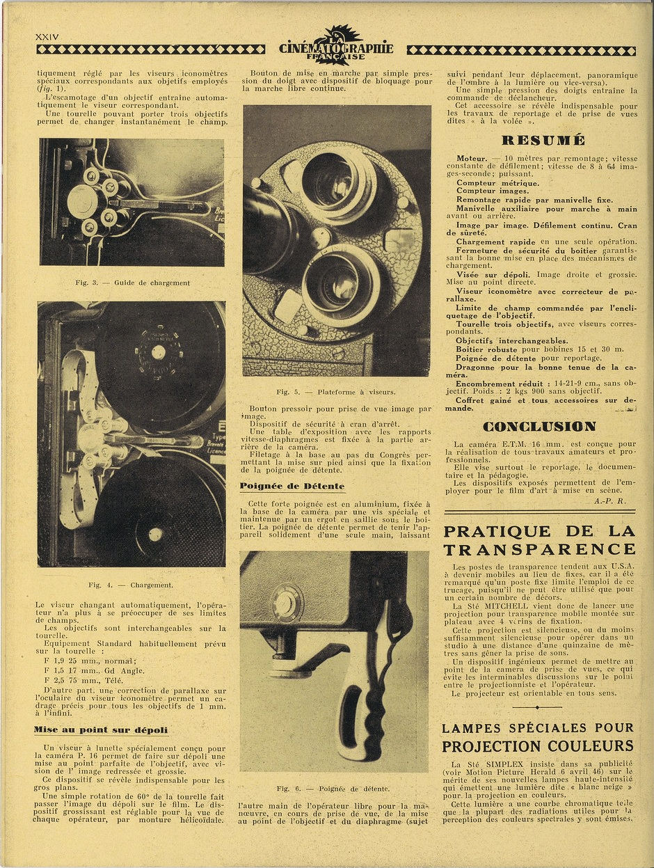 En 1946 E.T.M. (Electro Technique & Mécanique) annonce sa première caméra 16 mm l'ETM P.16 dans la revue "Cinématographie Française", n° 1176, 5 octobre 1946.