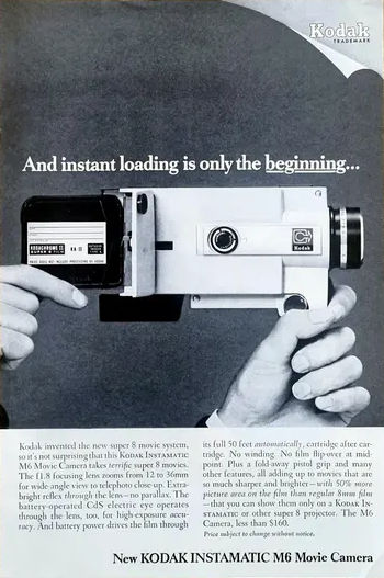 En 1965 Kodak lance le format Super 8 et sa première génération de caméras utilisant ce format. Pensées pour l’amateur familial, ces appareils compacts et faciles à utiliser prolongent l’esprit des appareils photo Instamatic : chargement simplifié, ergonomie dépouillée et exposition largement automatisée.