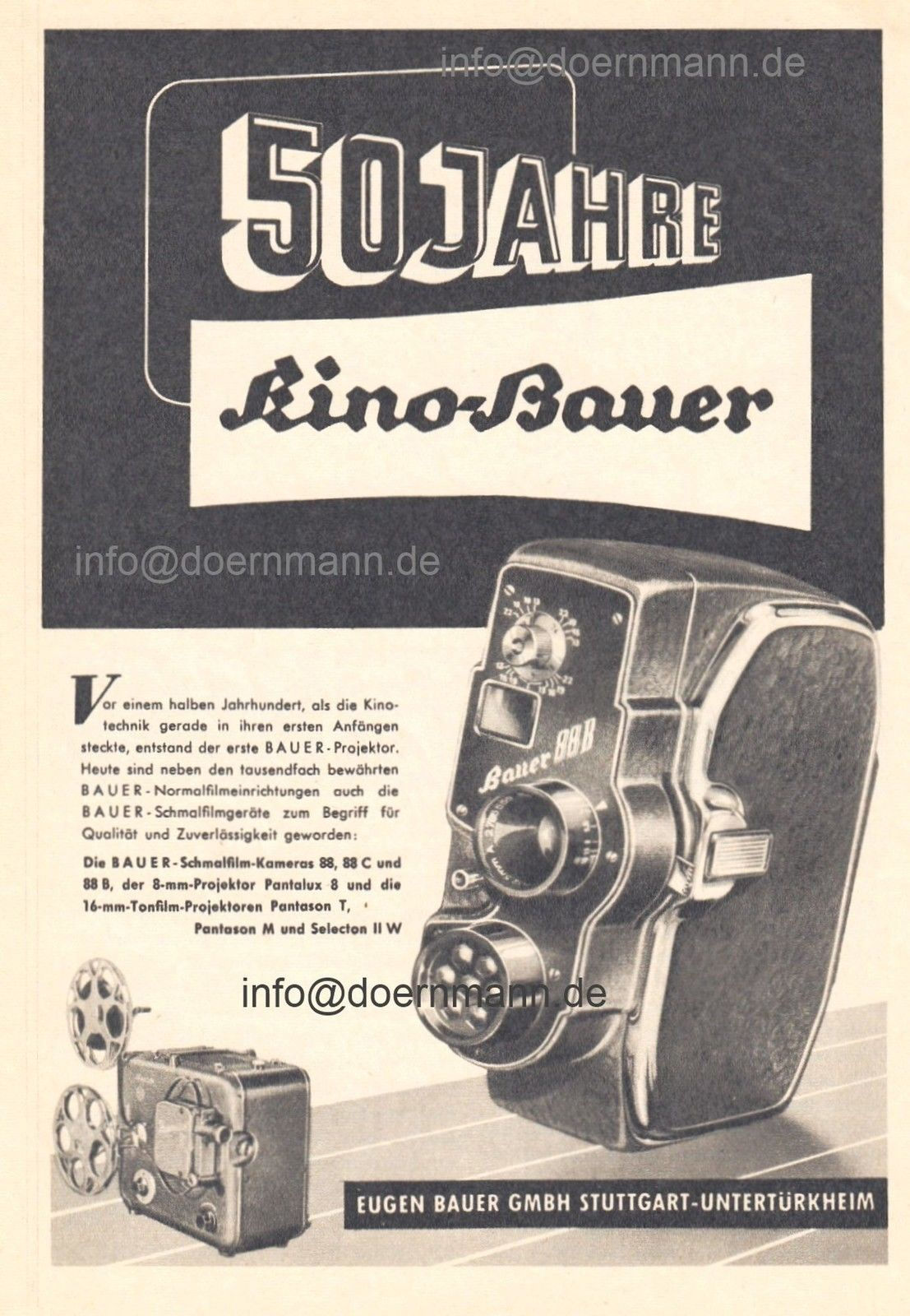 En 1953, BAUER frappe un grand coup en équipant son second modèle d'une cellule photo sensible d'un objectif ouvrant à 1.9 et de 4 cadences de prise de vue.. Une traduction de la publicité présentée ci dessous décrit fidèlement les caractéristiques de de modèle :