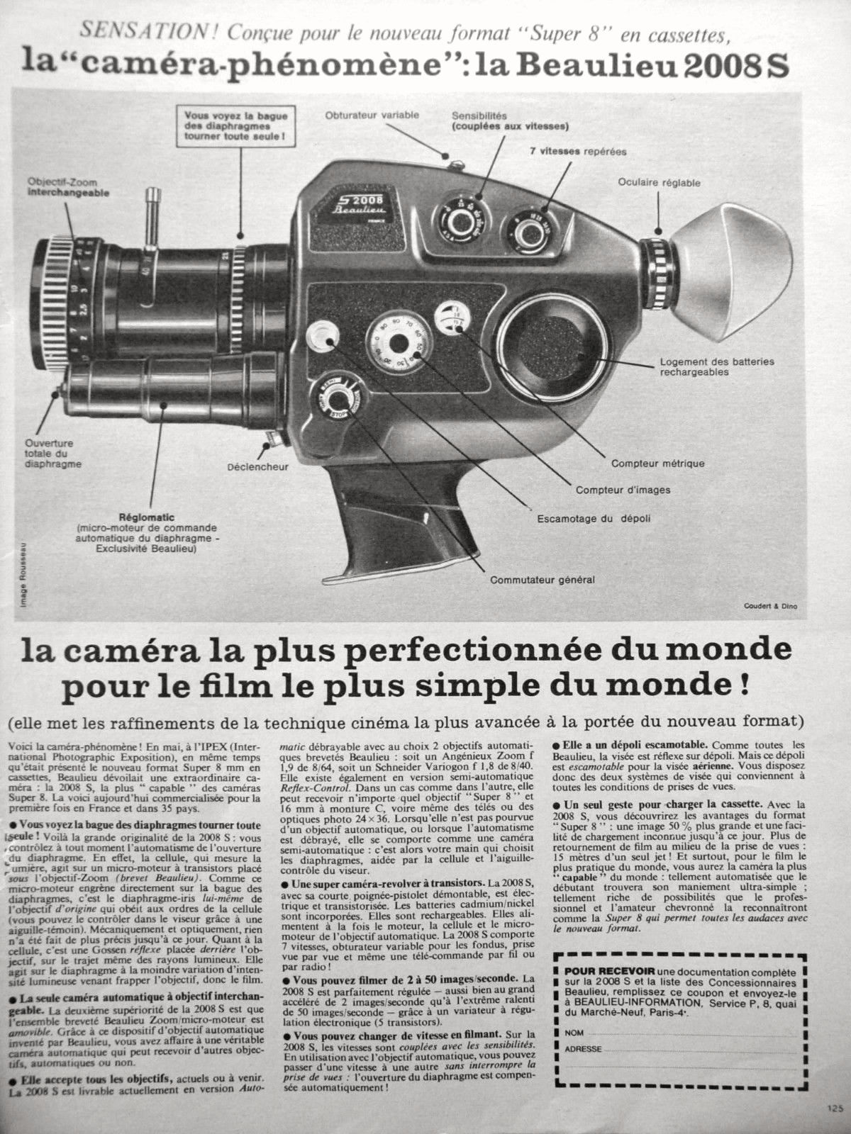 "En Mai 1965, à l'IPEX (Internation Photographic Exposition) de New-York en même temps qu'était présenté le nouveau format de film, le Super 8 mm en cassettes, Beaulieu dévoilait une extraordinaire caméra : la 2008 S".