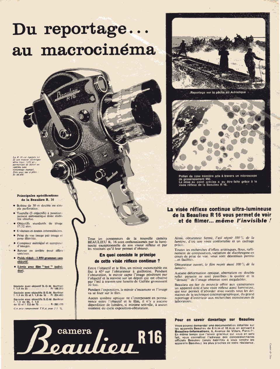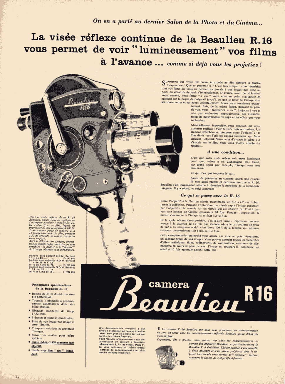 En 1958 la société Marcel BEAULIEU renouvelle sa gamme 16mm avec un premier modèle à visée reflex : la BEAULIEU R16: Annoncée au salon de la photo et du cinéma en octobre 1957, elle sera mise en vente à partir de Mars 1958. Produit jusqu'en 1962, ce modèle emblématique débute une longue série de caméras semi-professionnelles qui se poursuivra, à travers ses évolutions successives, jusqu'au milieu des années 80. Sa silhouette inspirera également celle des modèles 8 mm (R8 et suivants) et plus tard celle des premiers modèles Super 8 (2008 et 4008).