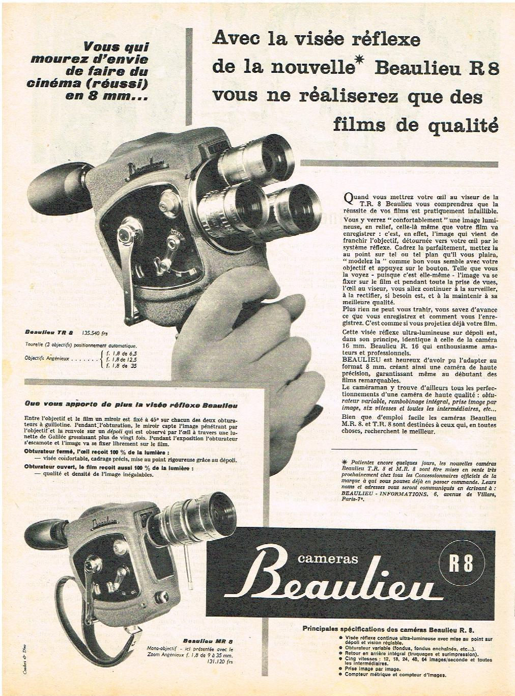 Le modèle R8 de BEAULIEU est présenté en 1959. La MR8 est la version mono-objectif, la TR8 la version à tourelle. Le "R" de R8 correspond à "Reflex". En effet BEAULIEU reprend ici, dans ses modèles 8 mm, le système de visée reflex qui avait fait le succès de la R16 quelques temps au paravent.