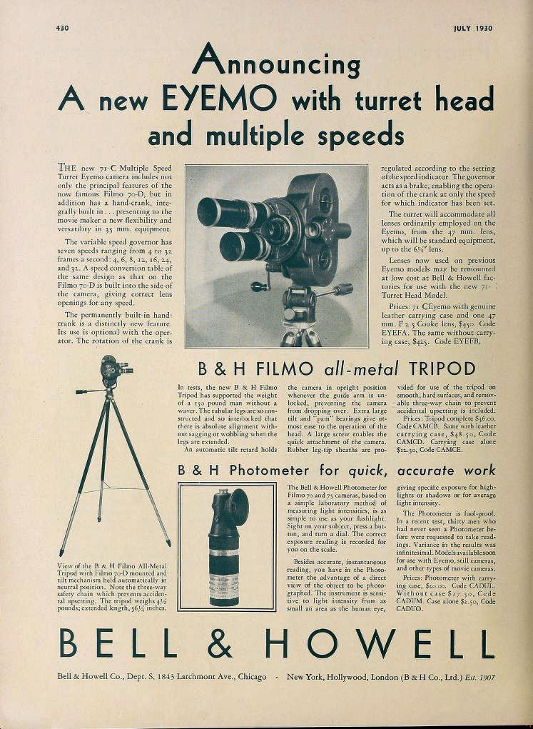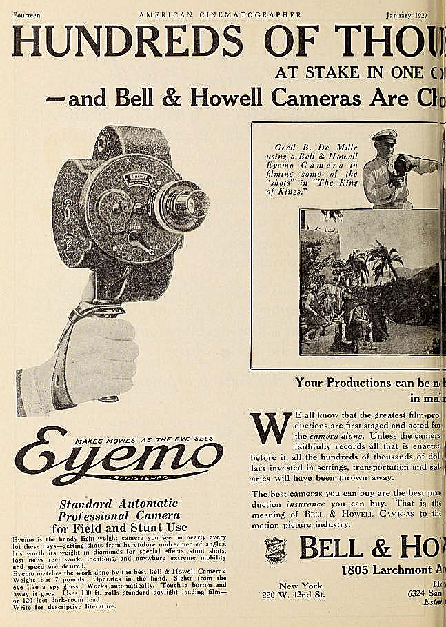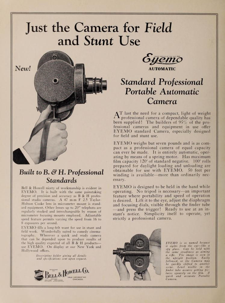 Bien que destiné aux professionnels par le format de film utilisé, 35 mm, la modèle Eyemo mérite de figurer dans cet inventaire pour sa présence sur les sites d'enchères en ligne et sa place dans l'histoire du cinéma de reportage. Lancé en 1925, par Bell & Howell, il suivra l'évolution de la Filmo 70, crée 2 années plus tôt.