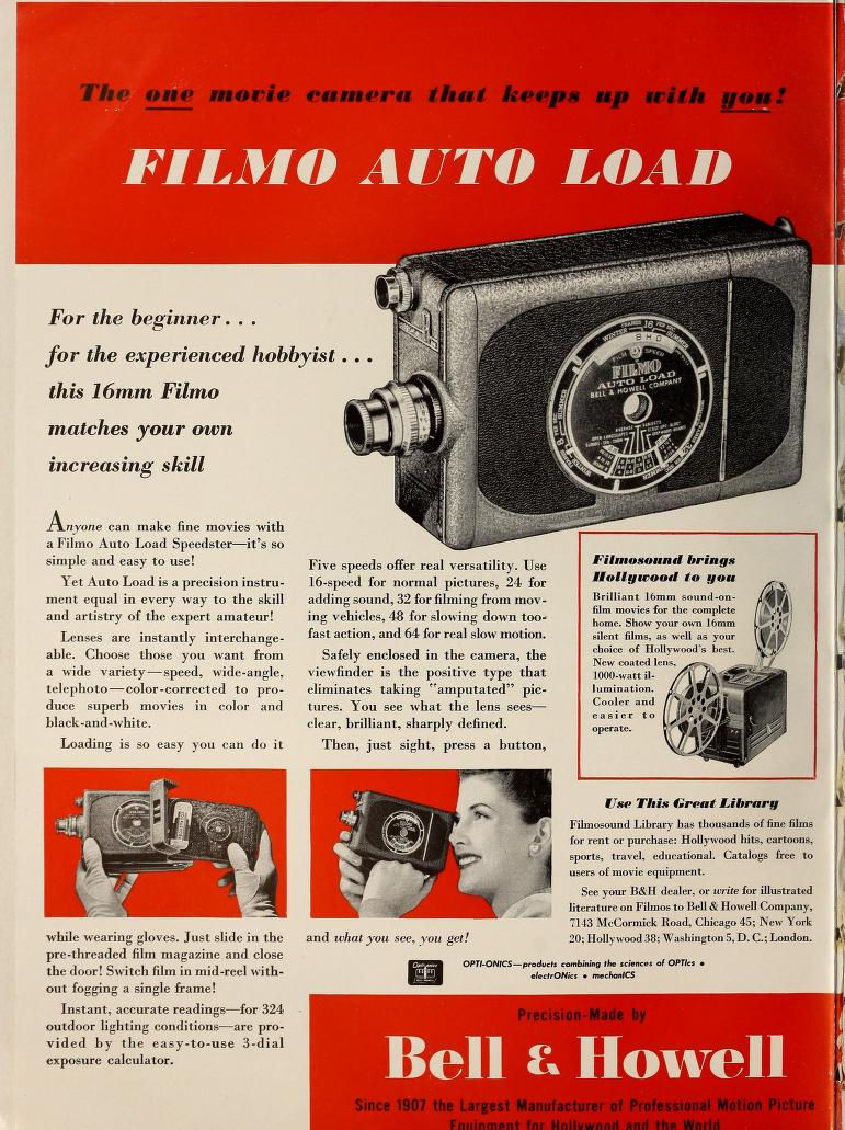 En juillet 1940, BELL & HOWELL remplace ses cameras à chargeur Filmo 141 par un nouveau modèle dénommé Filmo Auto Load. De forme et de poids sensiblement identiques aux modèles précédents, il s'en distingue par une nouvelle poignée disposée sous la camera et vissée dans le pas de fixation du pied. On remarquera également un système de visée plus lumineux. Deux plages de vitesses sont disponibles, 8 à 32 images par seconde ou 16 à 64 images par seconde sur le modèle dénommé "Speedster".