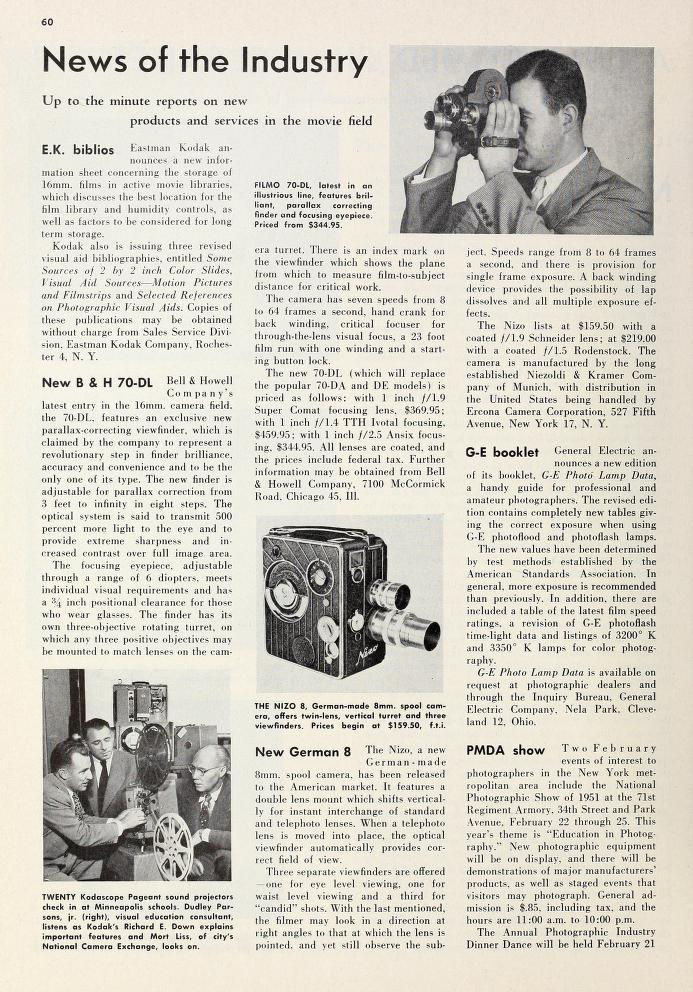 Début 1951, la Filmo 70-DL remplace les modèles 70-DA et 70-DE (voir annonce ci contre). La principale amélioration porte sur le système de visée qui intègre un barillet pouvant recevoir 3 petits objectifs correspondant aux optiques principales. Un système identique était déjà proposé sur la Filmo 70-DE mais comme simple accessoire du viseur de la 70-DA. On remarquera également un nouveau système de correction de parallaxe, une amélioration de l’oculaire et la présence en série d'un système de rembobinage intégral.
