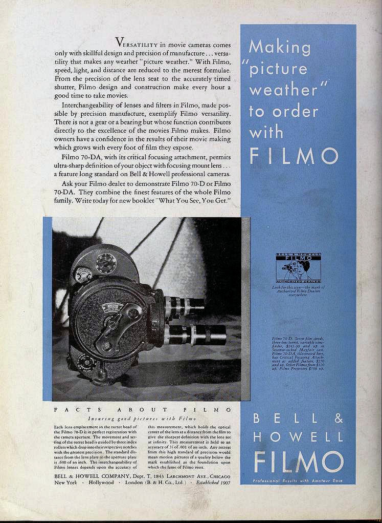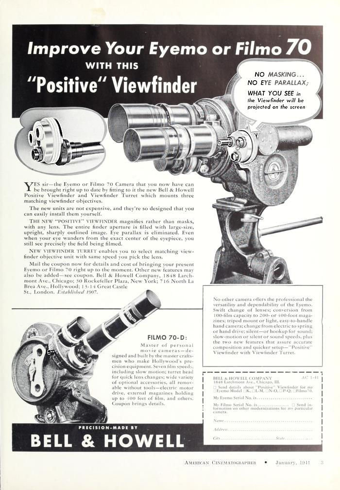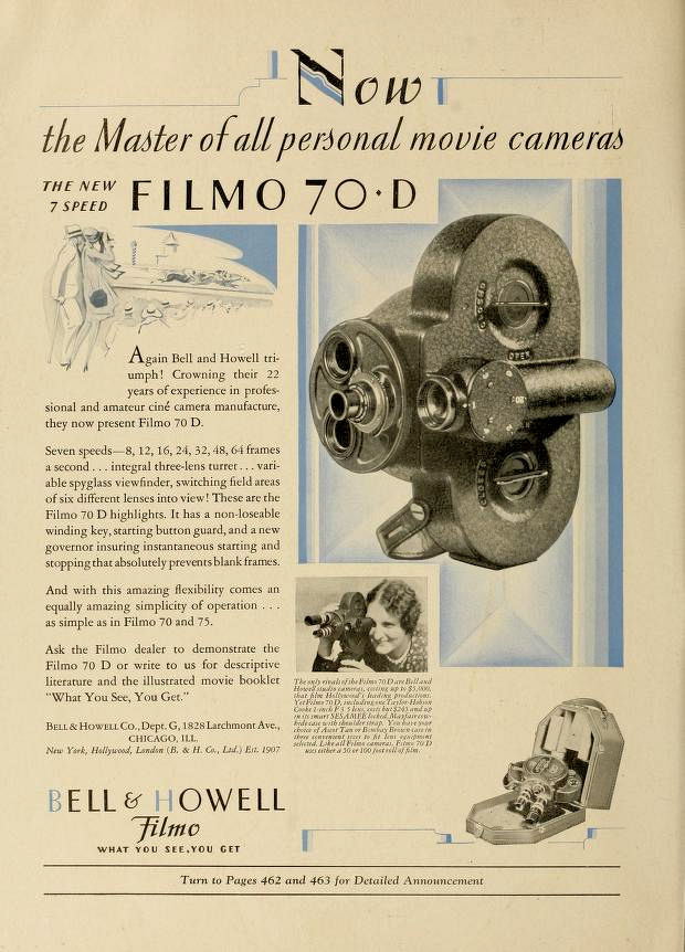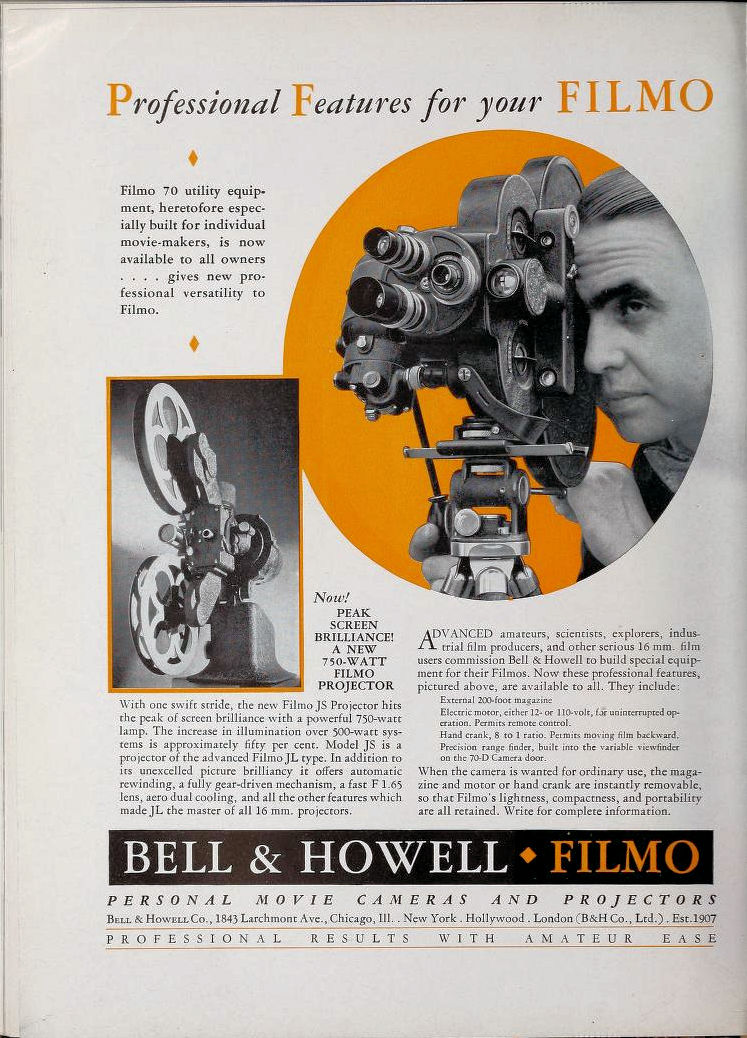 Dans le but d'accroître l'efficacité et la polyvalence de la caméra FILMO 70 Bell and Howell propose, en 1933, une série d'accessoires qui peuvent être adaptés à n'importe quelle caméra existante et qui apportent à cet appareil une telle perfection qu'elle peut être classé comme semi-professionnelle,