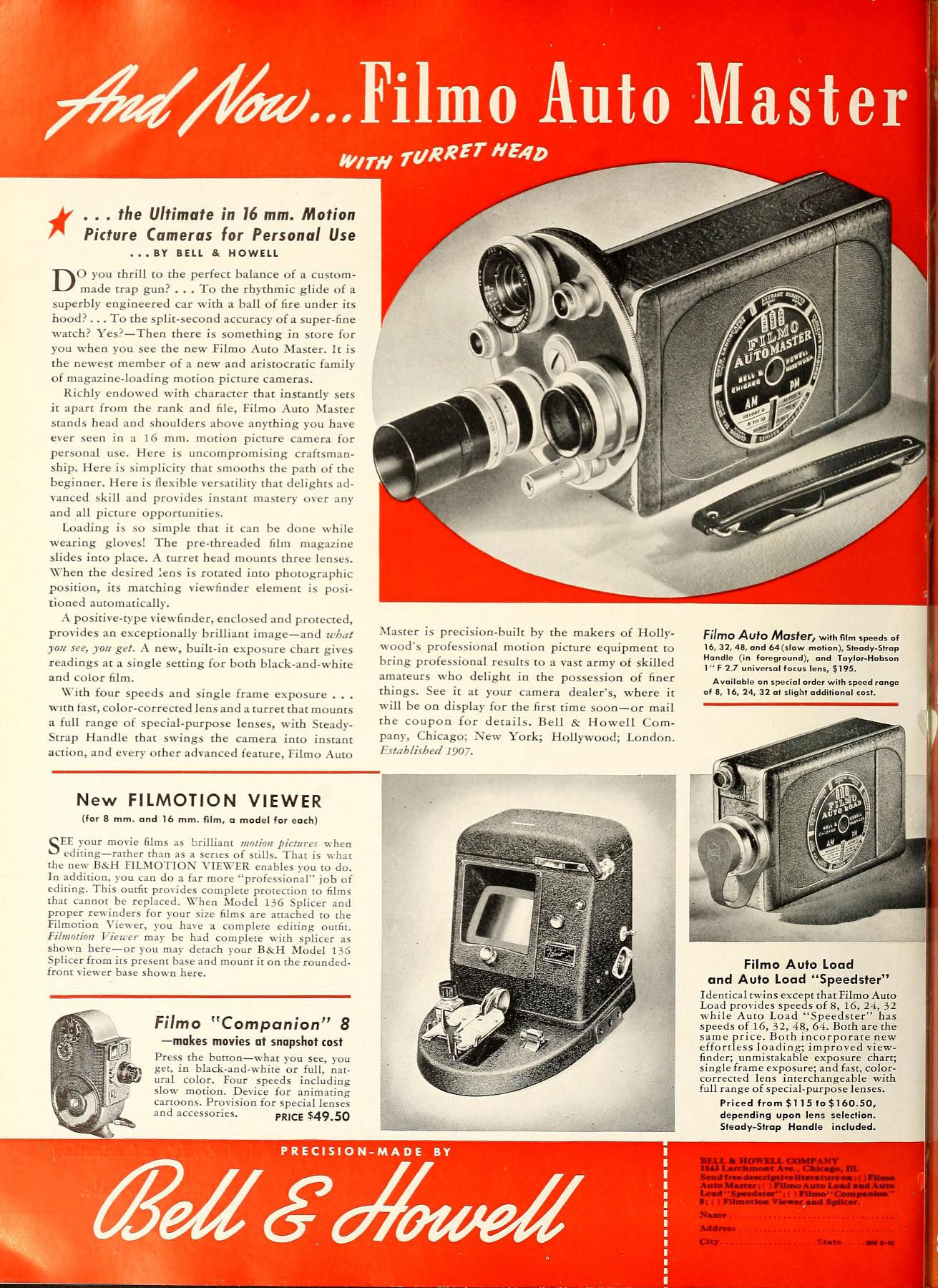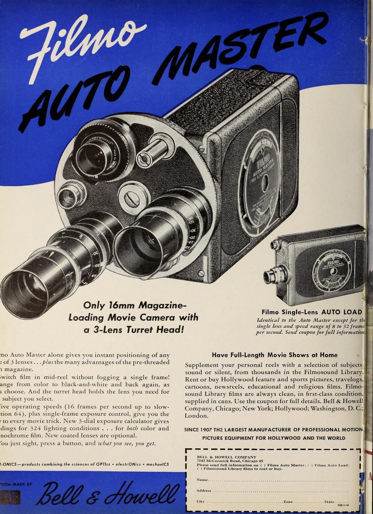 En Aout 1940, BELL & HOWELL présente son dernier modèle de camera personnelle 16mm .l'Auto-Master 16 Il s'agit d'une évolution de la caméras Auto Load à chargeur par magasin présentée un mois plus tôt. Le magasin de film préchargé Eastman Kodak est utilisé.