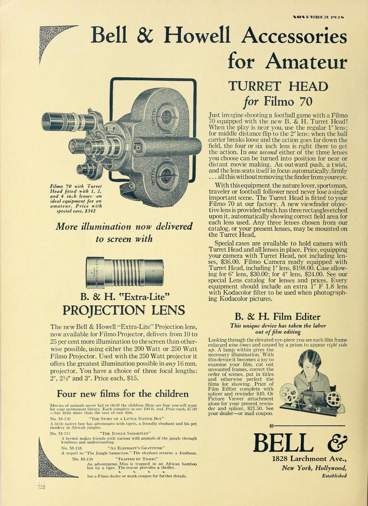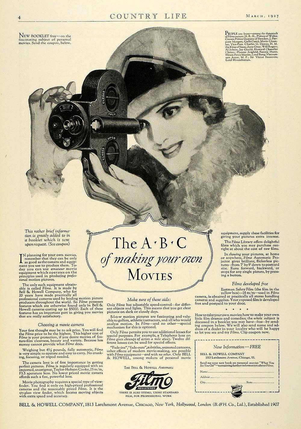 En Janvier 1923, EASTMAN KODAK COMPANY propose un nouveau film au format 16 mm, réversible et sûr à base d'acétate ainsi qu'une caméra légère et un projecteur permettant de le visionner. Début 1924, BELL & HOWELL lance la Filmo Automatic Cine Camera. Cette caméra utilise le même type de film mais intègre un moteur d'entrainement à ressort qui dispense de l'utilisation d'un trépied. De ces deux inventions majeures naitra le cinéma amateur ...