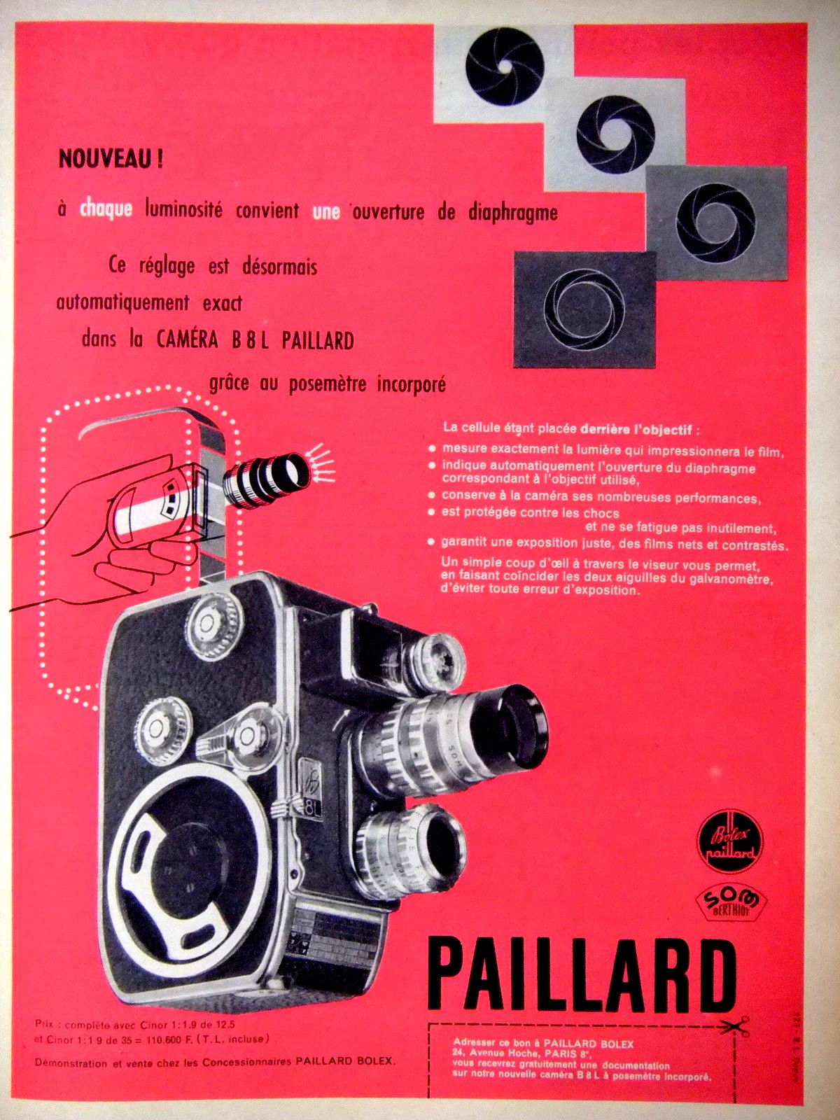 En 1958 BOLEX fait évoluer son modèle de camera à 2 objectifs en l'équipant d'une cellule placée derrière l'objectif; ce sera la B-8L.