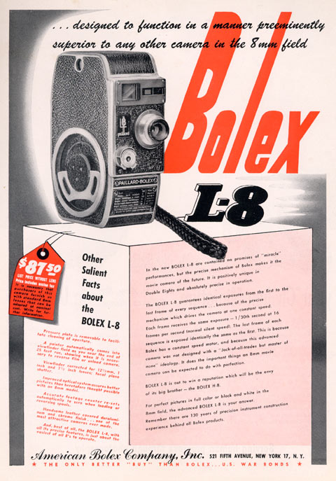 Après s'être exclusivement consacré, depuis ses débuts,, aux modèles "haut de gamme" (H-16 H-8), Paillard-Bolex présente en 1942 la caméra L-8, un modèle économique dans un boitier compact mono-objectif à mise au point fixe et ne disposant que d'une seule vitesse.