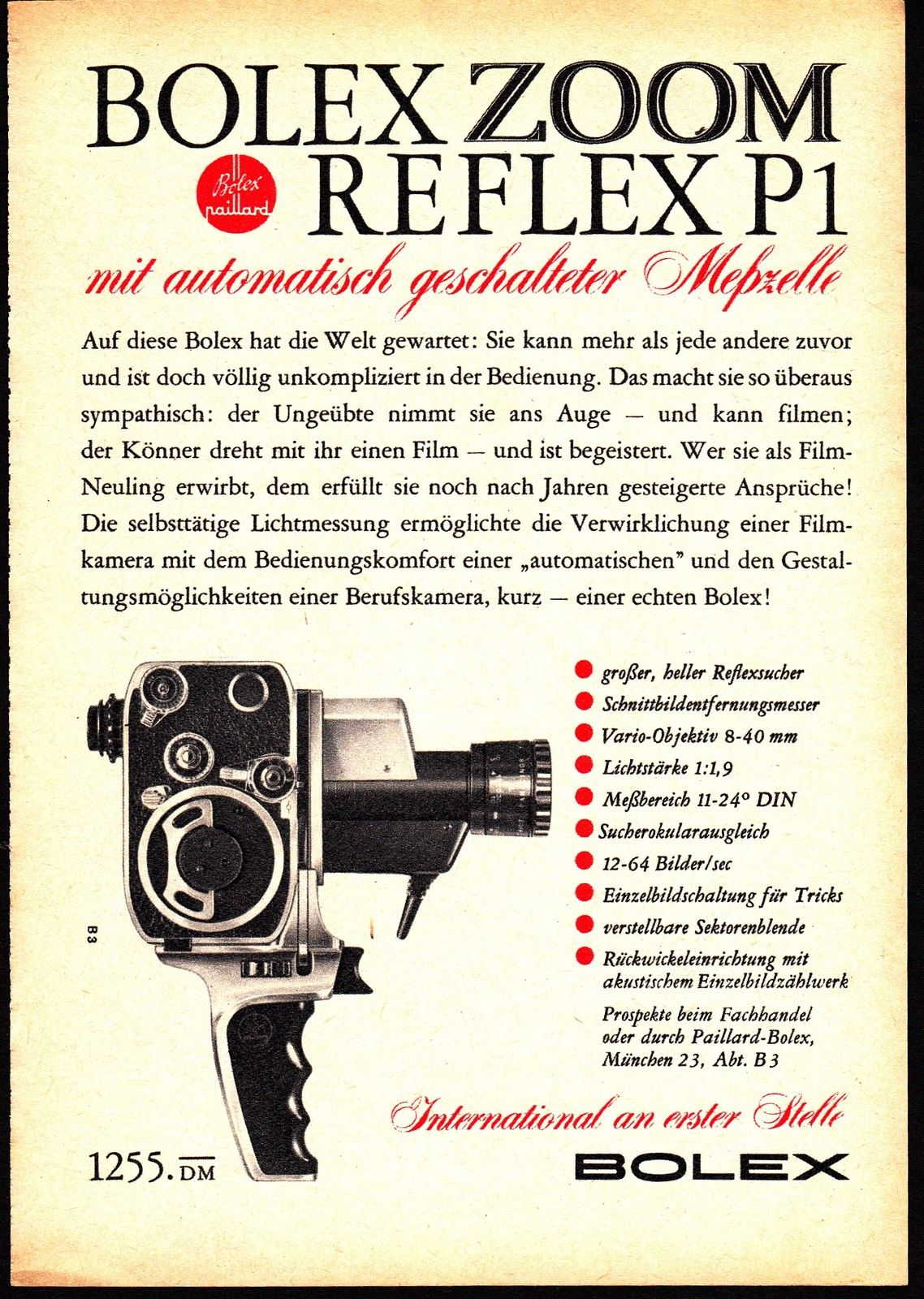 En 1961 BOLEX remplace la C-8L avec zoom Pan-Cinor par la P1 Zoom Reflex. Si le nouveau modèle utilise toujours le Pan-Cinor 40 de Berthiot le système de visée est intégré au corps de la camera.La mesure de la lumière s'effectue toujours de façon semi-automatique à travers l'objectif grâce à une cellule alimentée par pile longue durée; son réglage par une aiguille dans le viseur. La mise au point est assurée par un télémètre à coïncidence de champ.