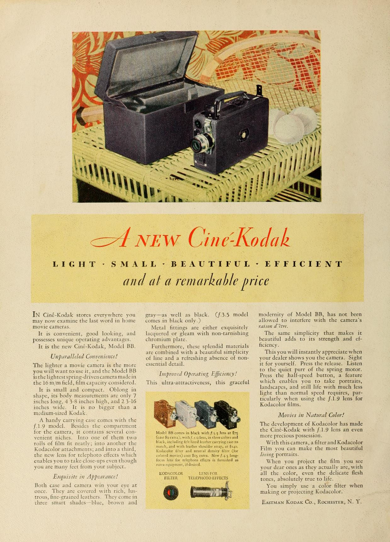 En Mai 1929 Eastman Kodak annonce le nouveau modèle Ciné-Kodak BB qui est une version réduite et allègée du modèle Ciné-Kodak B lancé en 1925. Le boitier de forme identique perd près de la moitié de son poids, passant de 2,4 kg à 1,38 Kg; Il ne peut toutefois recevoir que des bobines de 50 pieds.