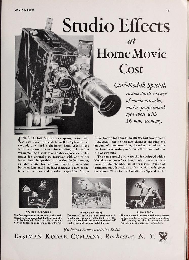 En mars 1933, Eastman Kodak présente la Cine-Kodak Special, une caméra 16 mm d’un niveau technique exceptionnel, destinée aux amateurs exigeants comme aux professionnels. Véritable concentré d’innovations, elle transpose dans le domaine du 16 mm des fonctionnalités jusqu’alors réservées aux caméras 35 mm : qualité de fabrication remarquable, possibilités mécaniques avancées et grande souplesse d’utilisation. La Special se distingue notamment par sa tourelle à deux objectifs interchangeables, son système de cassettes amovibles permettant l’emploi de films de 100 ou 200 pieds (30 à 60 mètres), ainsi que par de nombreux dispositifs facilitant la prise de vues technique ou créative. Conçue comme un outil complet, précis et durable, la Cine-Kodak Special marque une étape majeure dans l’histoire du 16 mm et s’impose rapidement comme une référence pour les cinéastes amateurs éclairés et les utilisateurs professionnels.