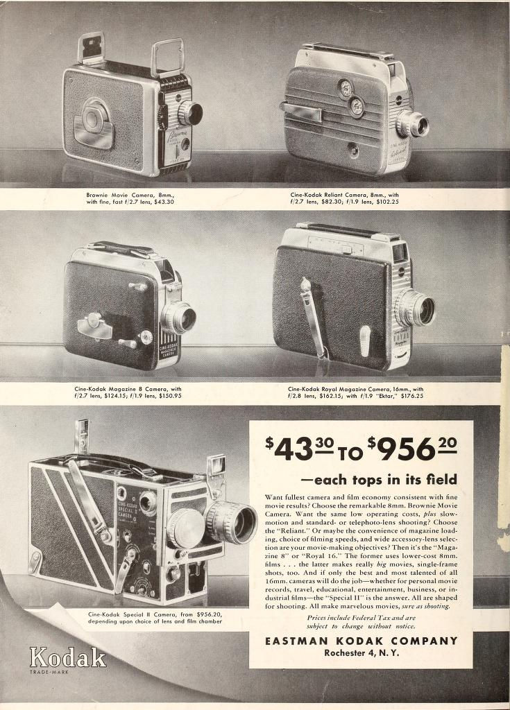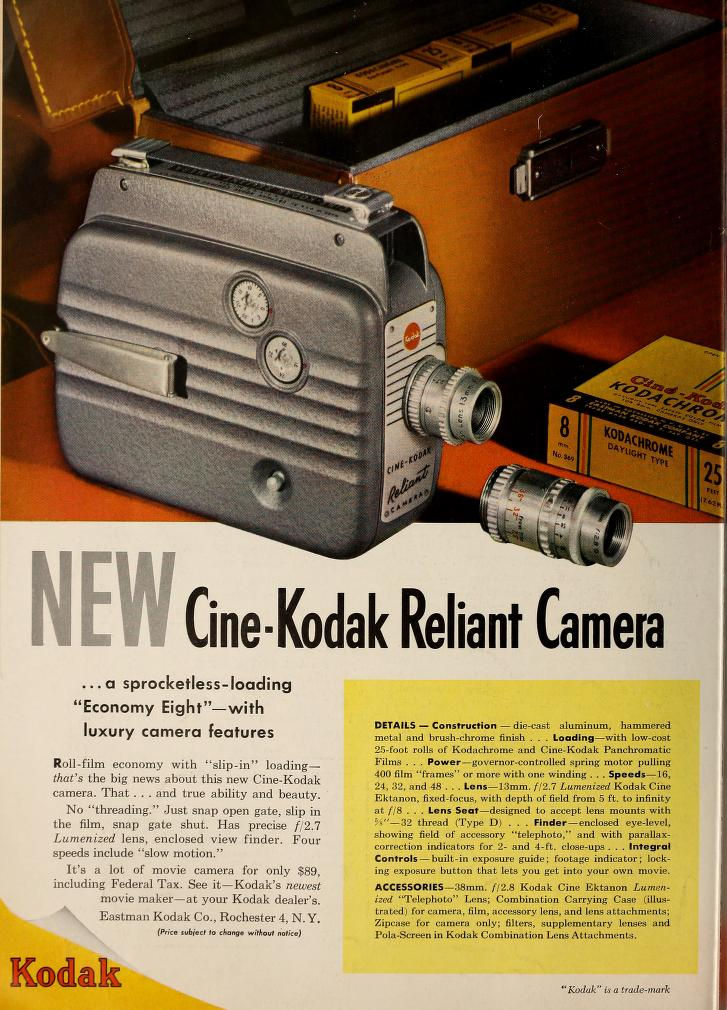 En Mai 1949 KODAK annonce la "Reliant", une caméra Double-8 à bobines qui remplacera la Cine-Kodak Eight 25 lancée en 1932. Ce modèle "d'entrée de gamme" y gagne en technicité (visée, chargement, cadences de prise de vue) même s'il y perd un peu en simplicité et beaucoup en ce qui concerne le prix d'achat. Il faudra attendre la Brownie, quelques années plus tard, pour retrouver un modèle équivalent à la "Eight" de 1932.