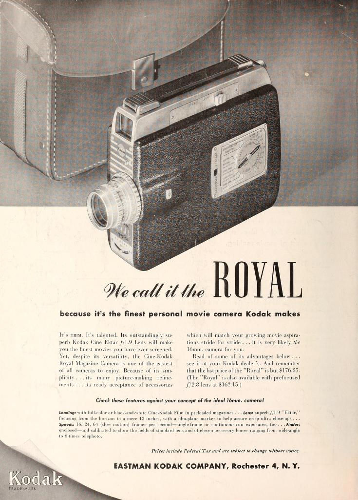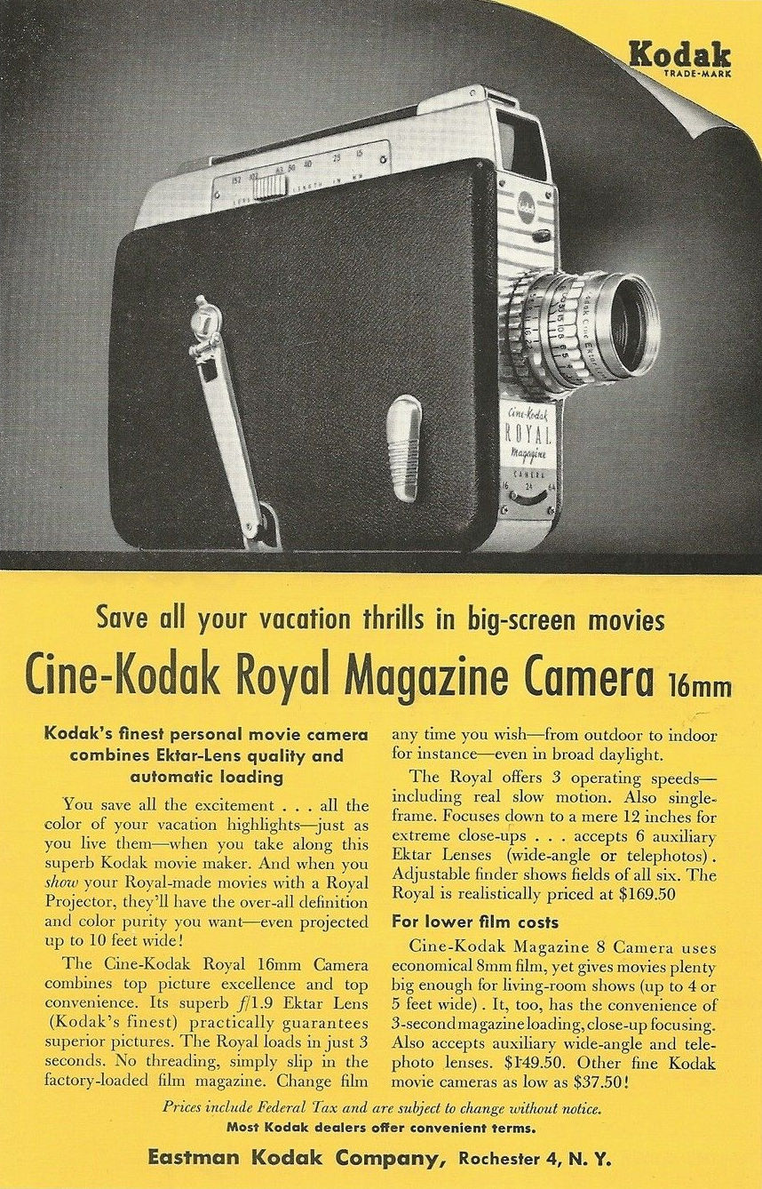 Fin 1950 EASTMAN KODAK COMPANY lance le modèle "Royal" à magazin 16 mm en remplacement de l'antique "Cine-Kodak Magazine 16" de 1936. Cette caméra adopte un nouveau viseur commun aux autres modèles de la marque. Les caractéristiques principales restent les même que le modèle précédent.
