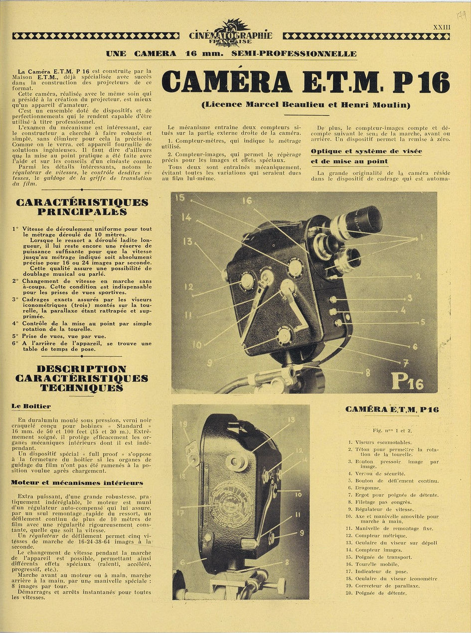 En 1946 E.T.M. (Electro Technique & Mécanique) annonce sa première caméra 16 mm l'ETM P.16 dans la revue "Cinématographie Française", n° 1176, 5 octobre 1946.