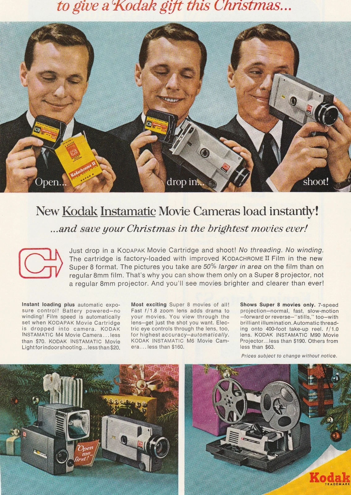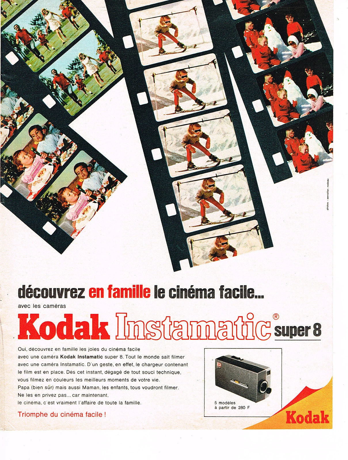 En 1965 Kodak lance le format Super 8 et sa première génération de caméras utilisant ce format. Pensées pour l’amateur familial, ces appareils compacts et faciles à utiliser prolongent l’esprit des appareils photo Instamatic : chargement simplifié, ergonomie dépouillée et exposition largement automatisée.
